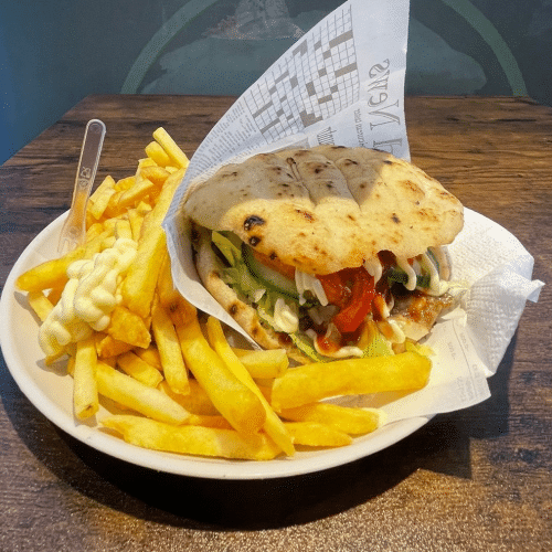 10 cevapi, sla, komkommer, ui en tomaat. Geserveerd met friet